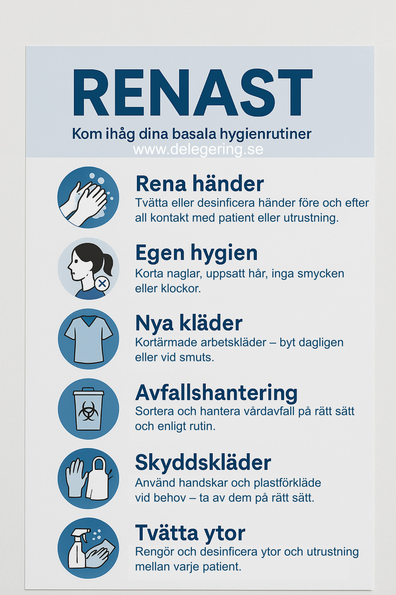 Att följa basala hygienrutiner handlar inte bara om att skydda patienterna – utan även dig själv och dina kollegor. RENAST är ett enkelt sätt att påminna sig själv – och varandra – om vad som gäller.